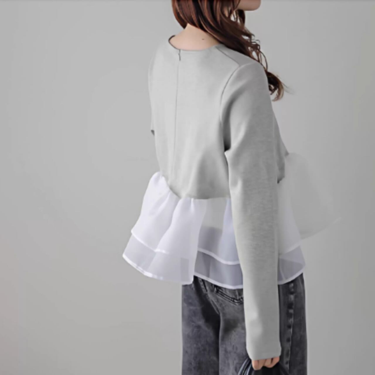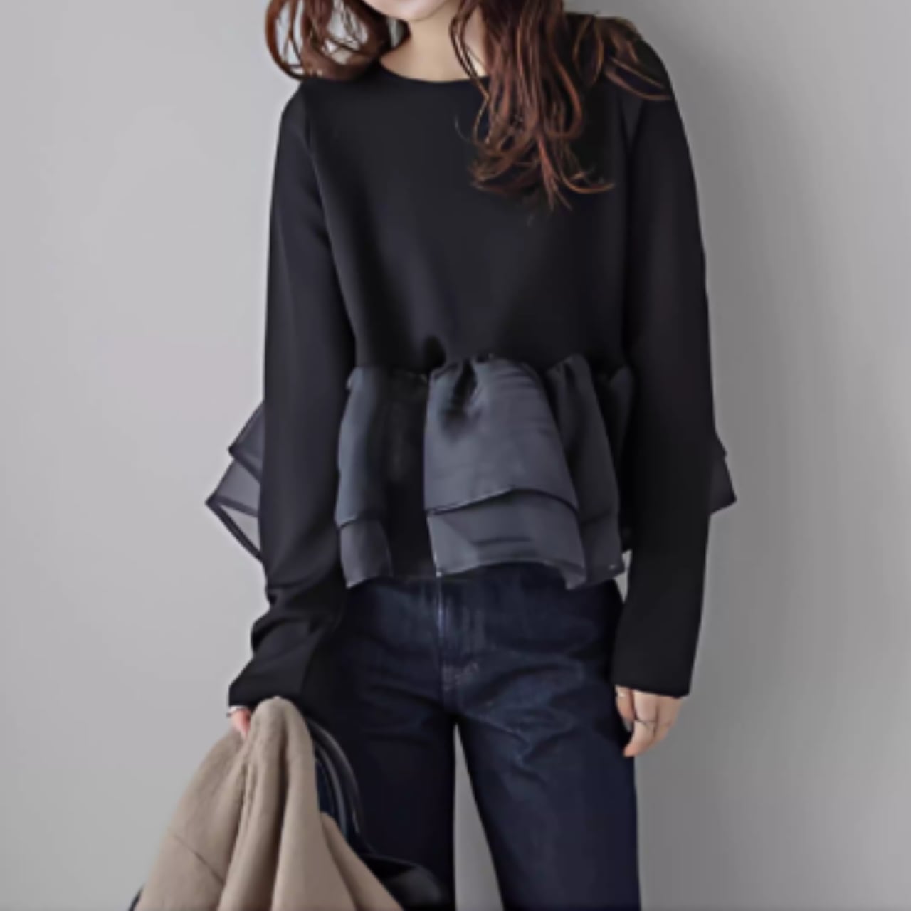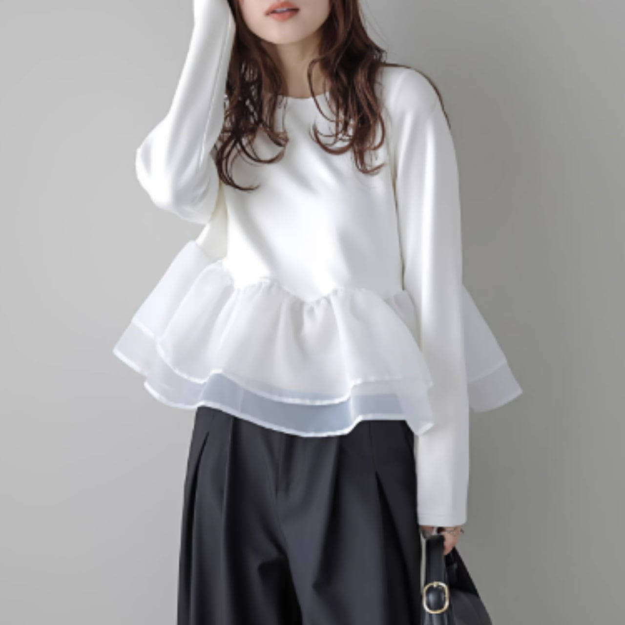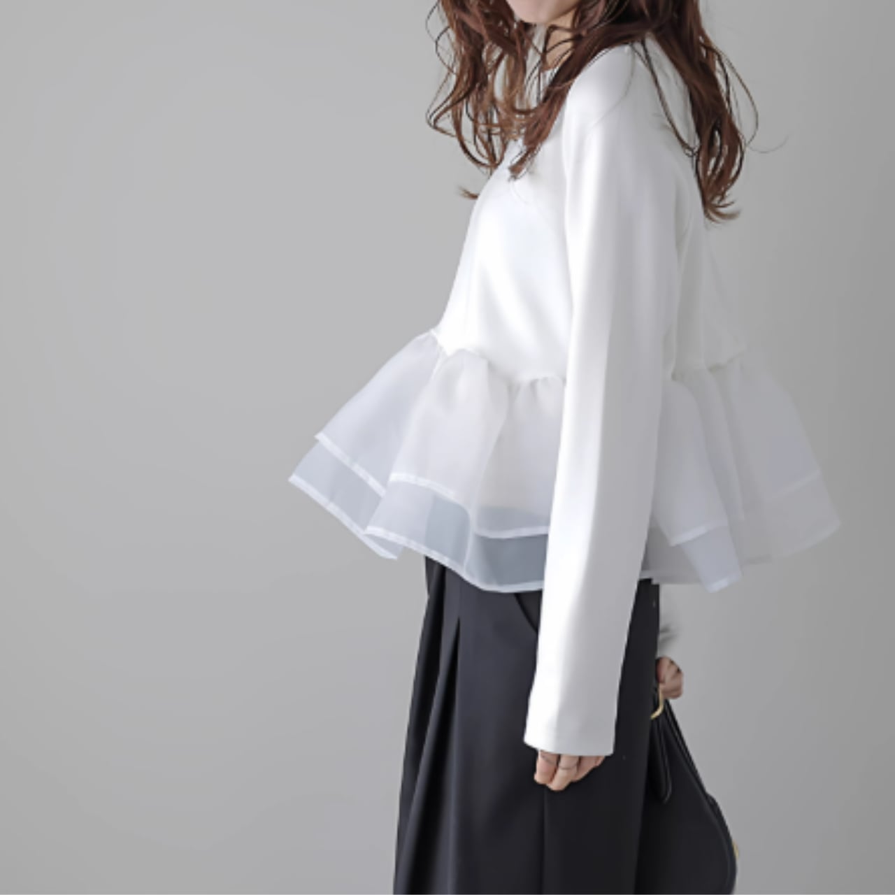 ふんわりと揺れるペプラムフリルが、フェミニンな印象をプラス。