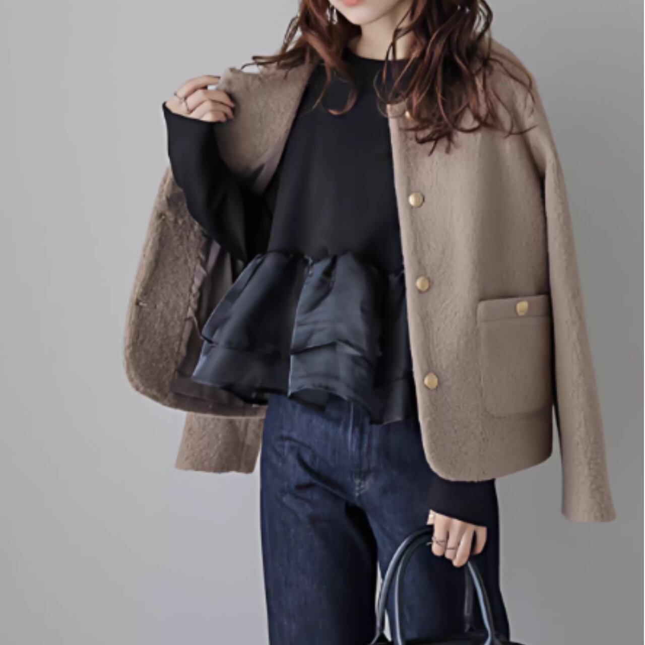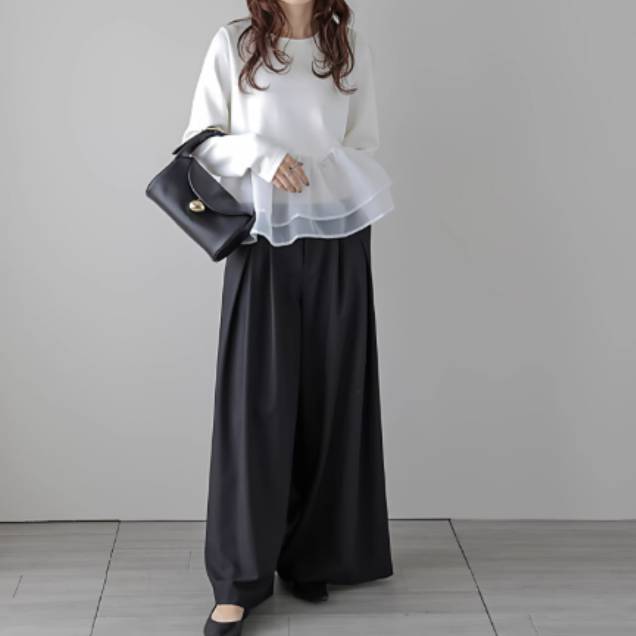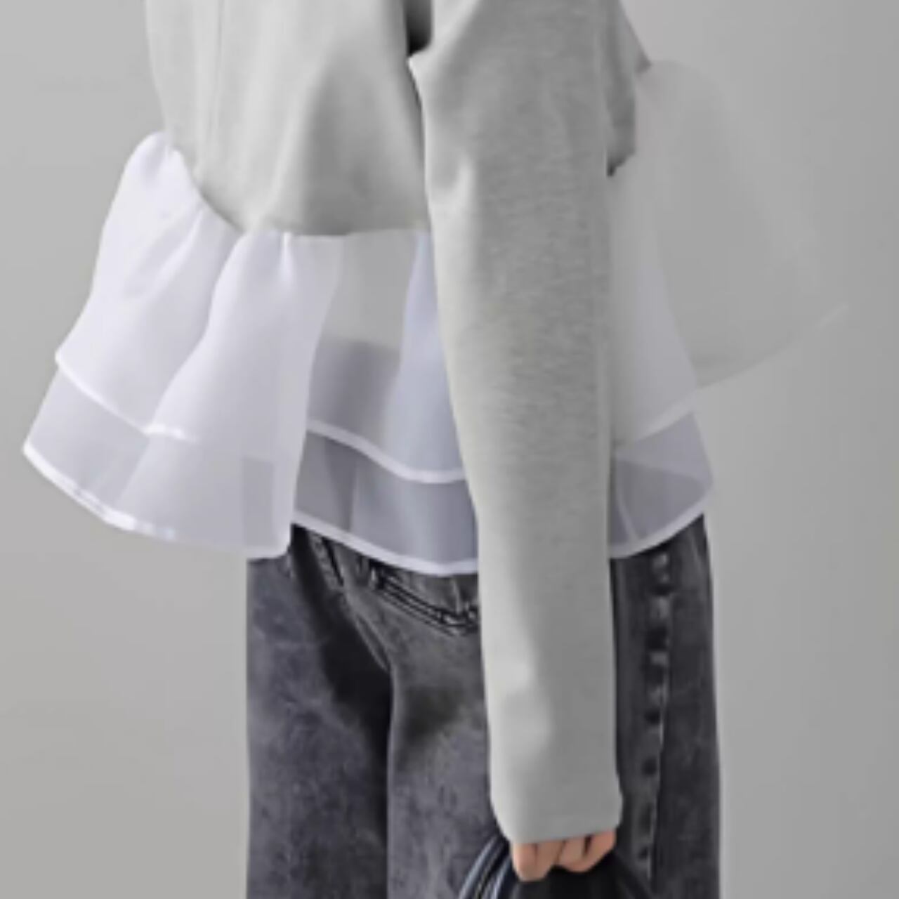 ふんわりと揺れるペプラムフリルが、フェミニンな印象をプラス。