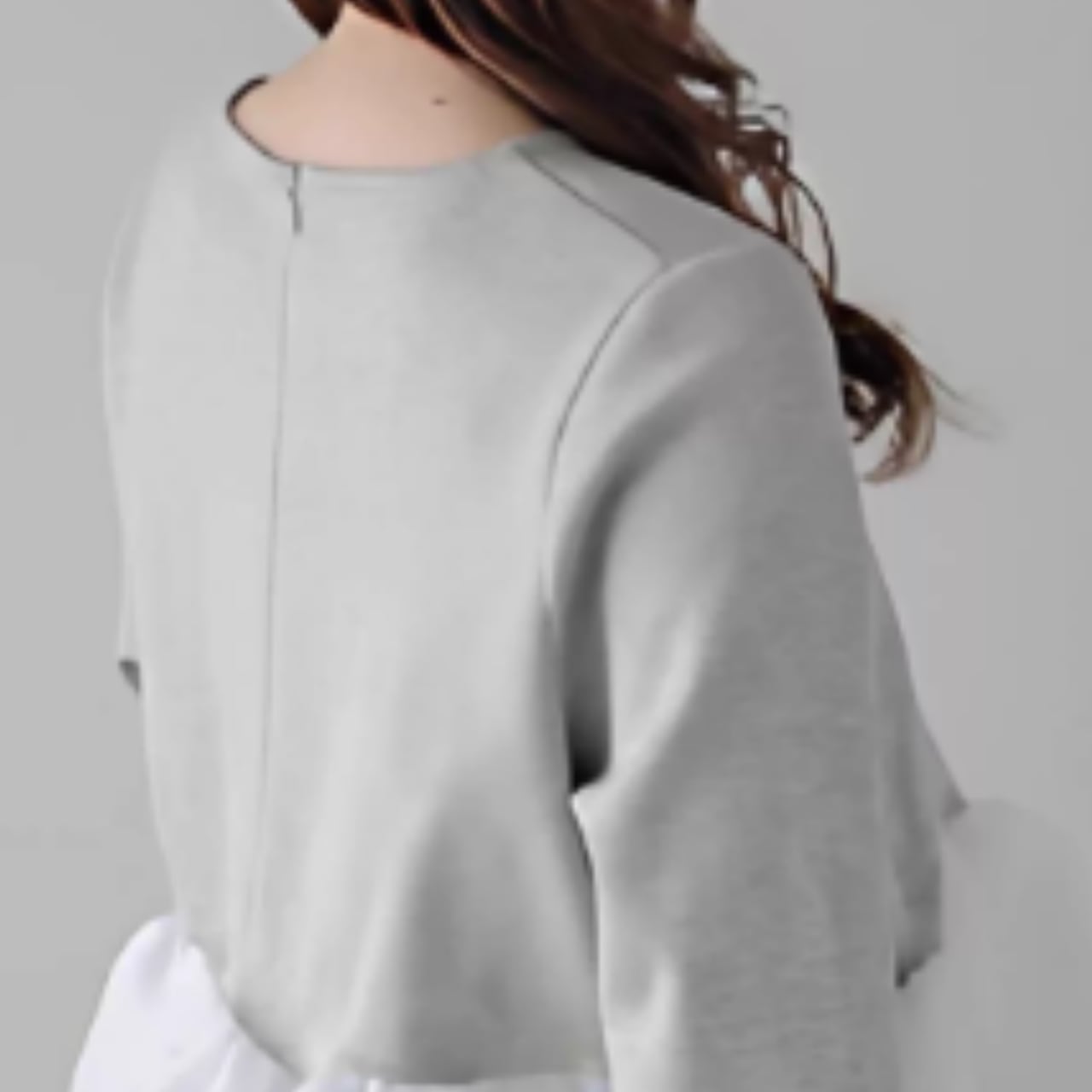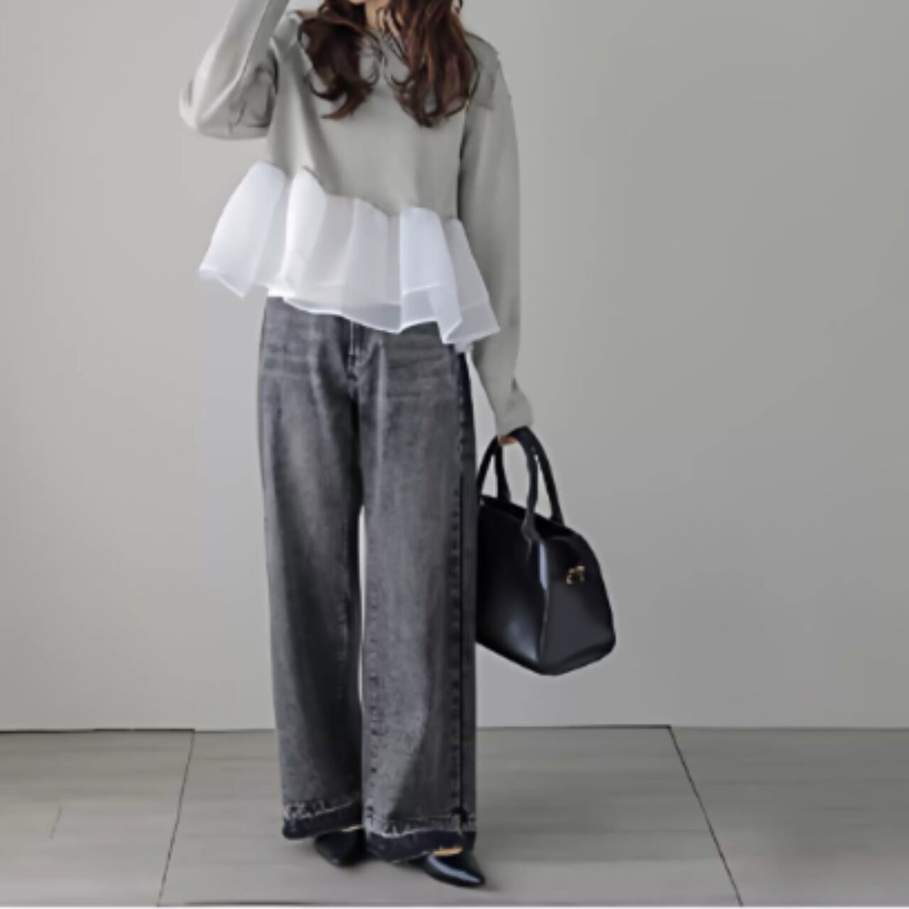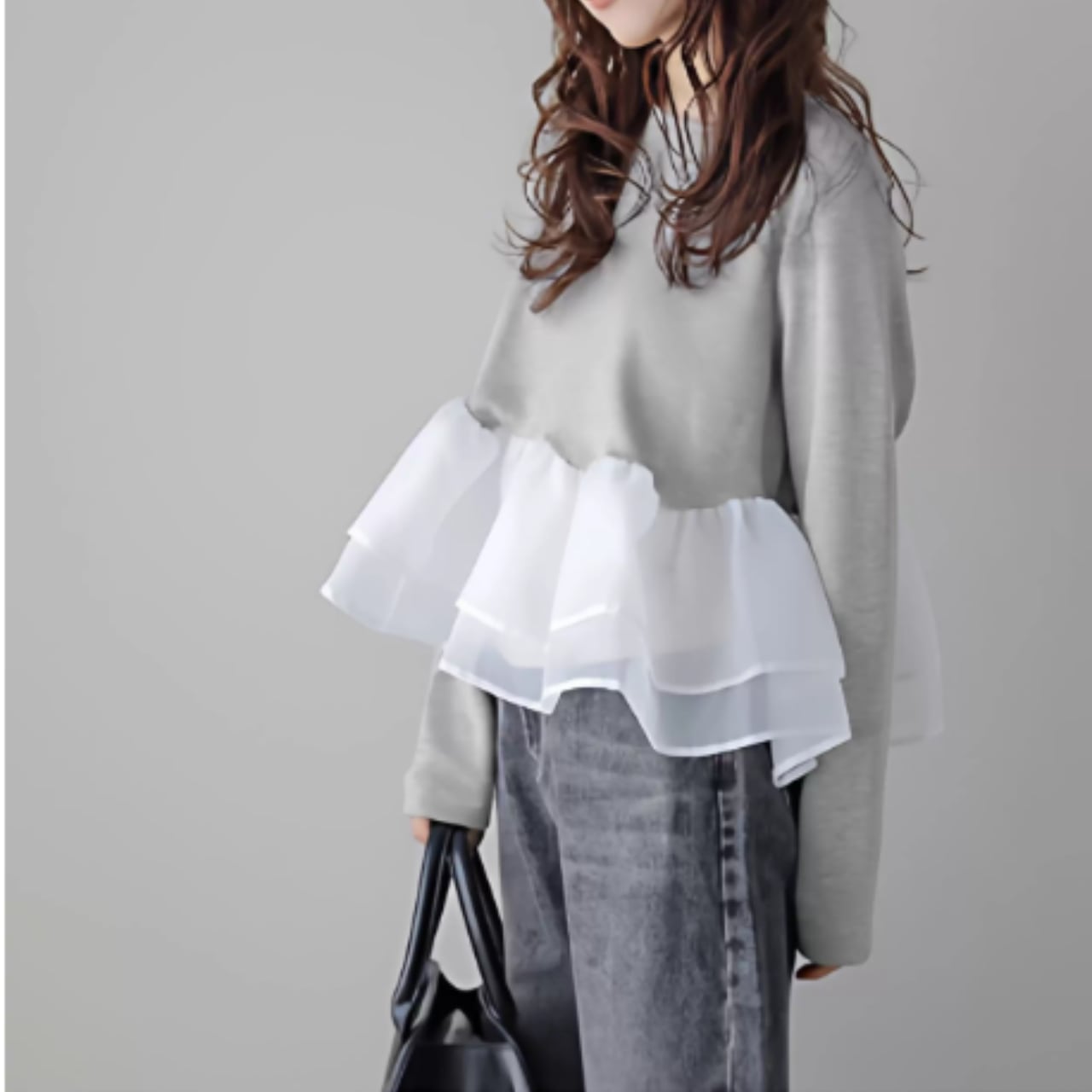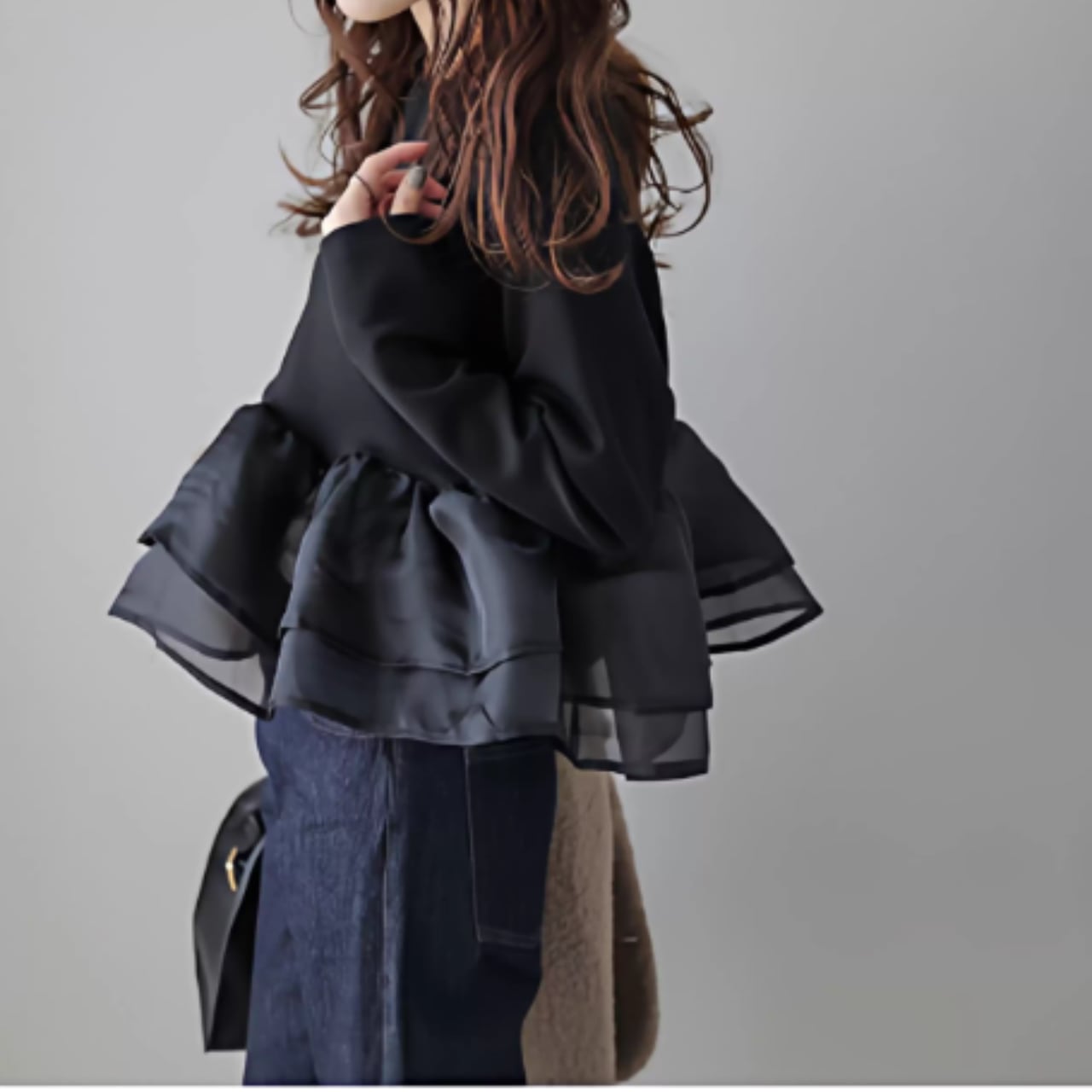ふんわりと揺れるペプラムフリルが、フェミニンな印象をプラス。