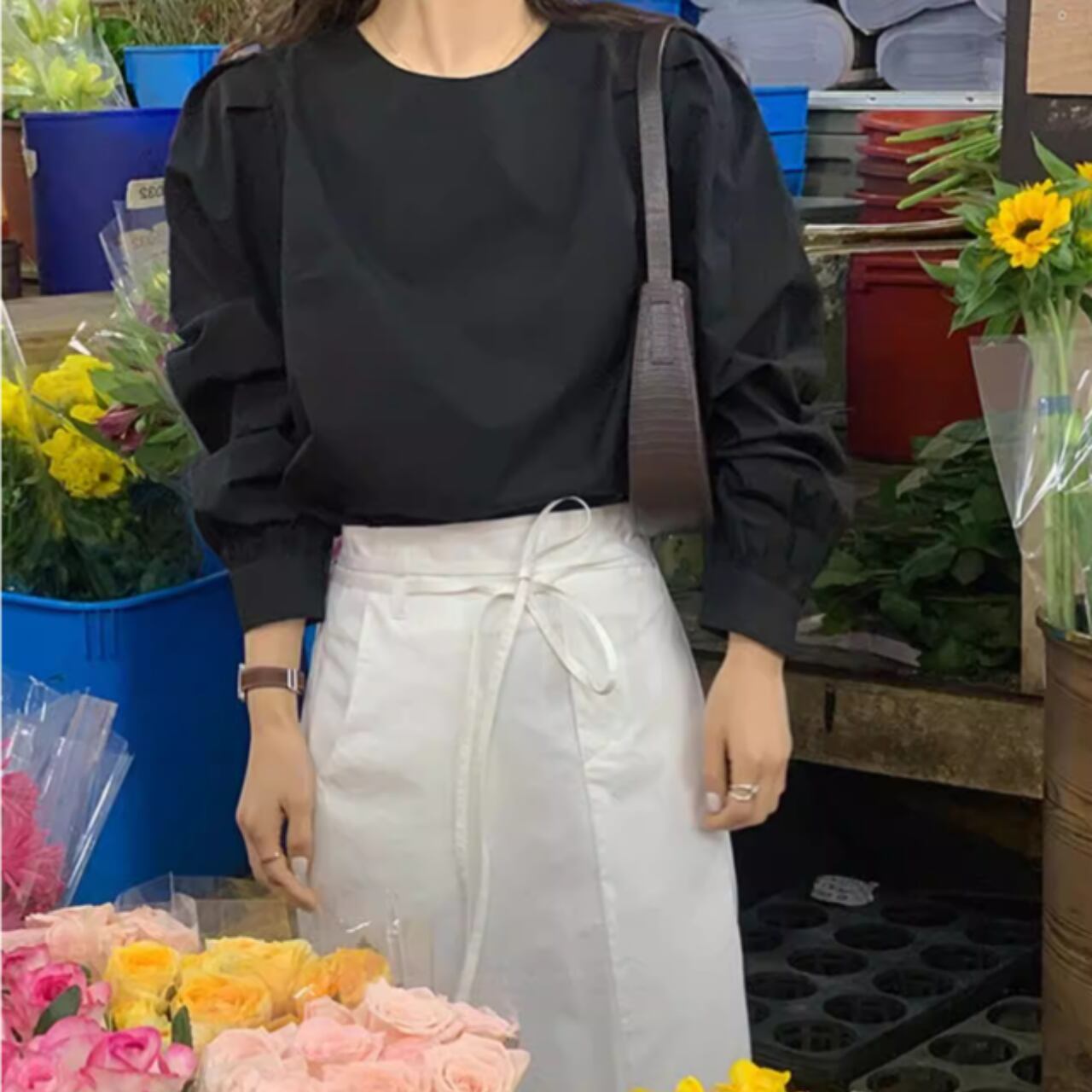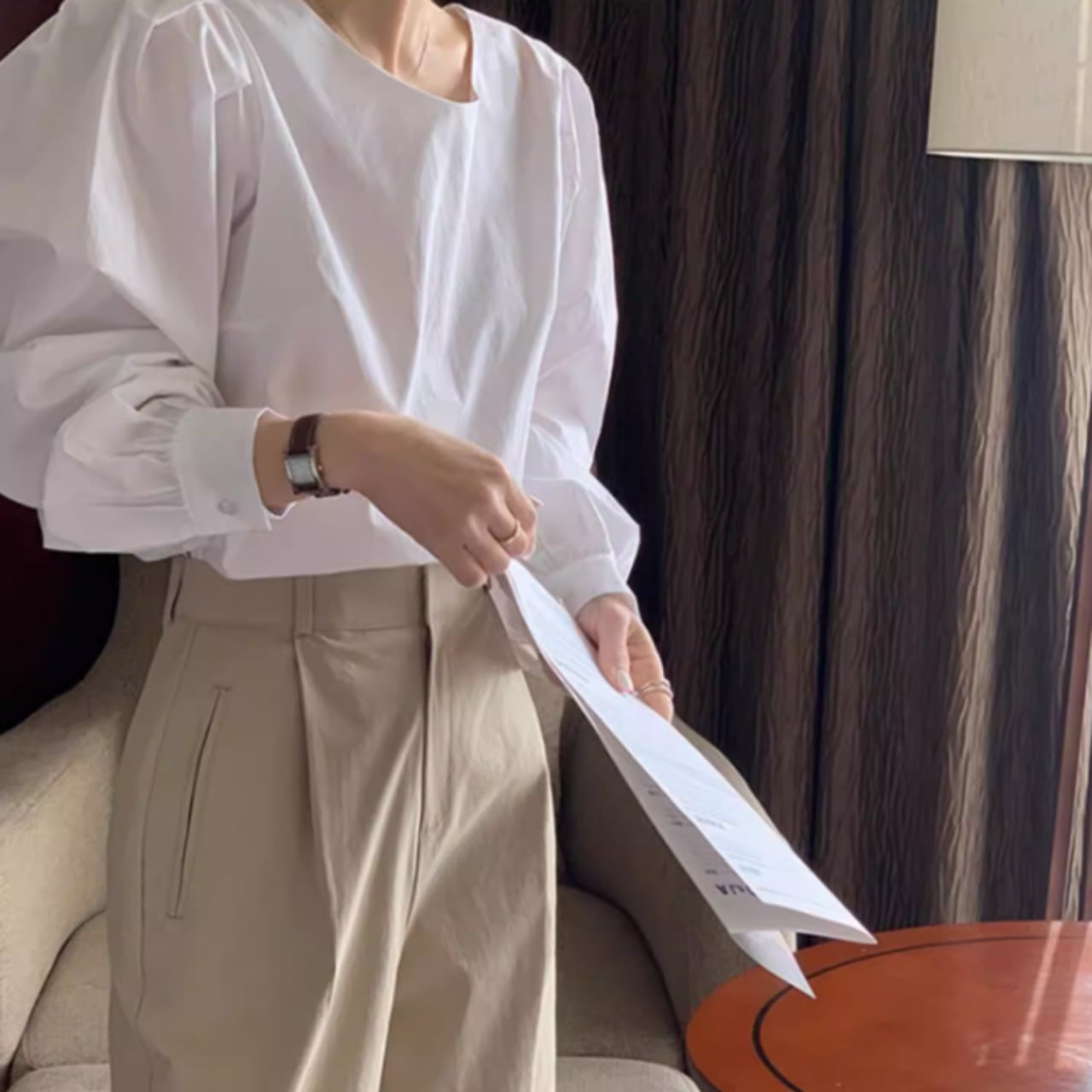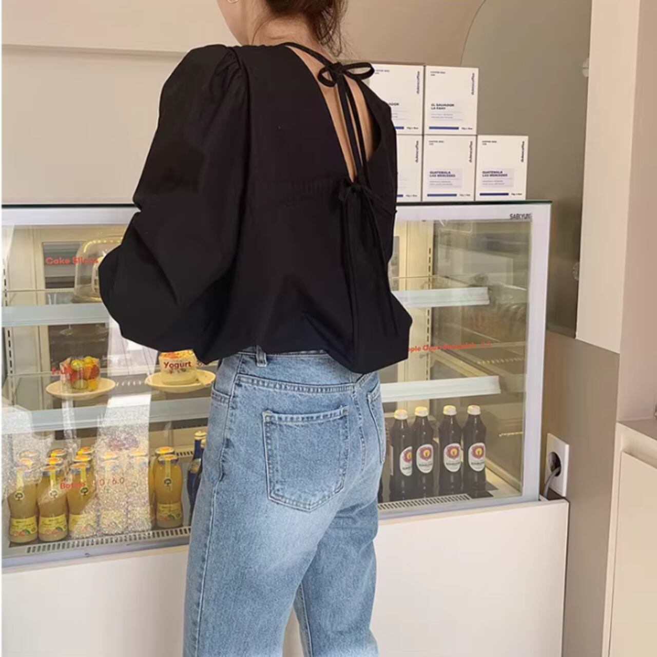 後ろ姿まで抜かりなく、女性らしさを演出するブラウス。