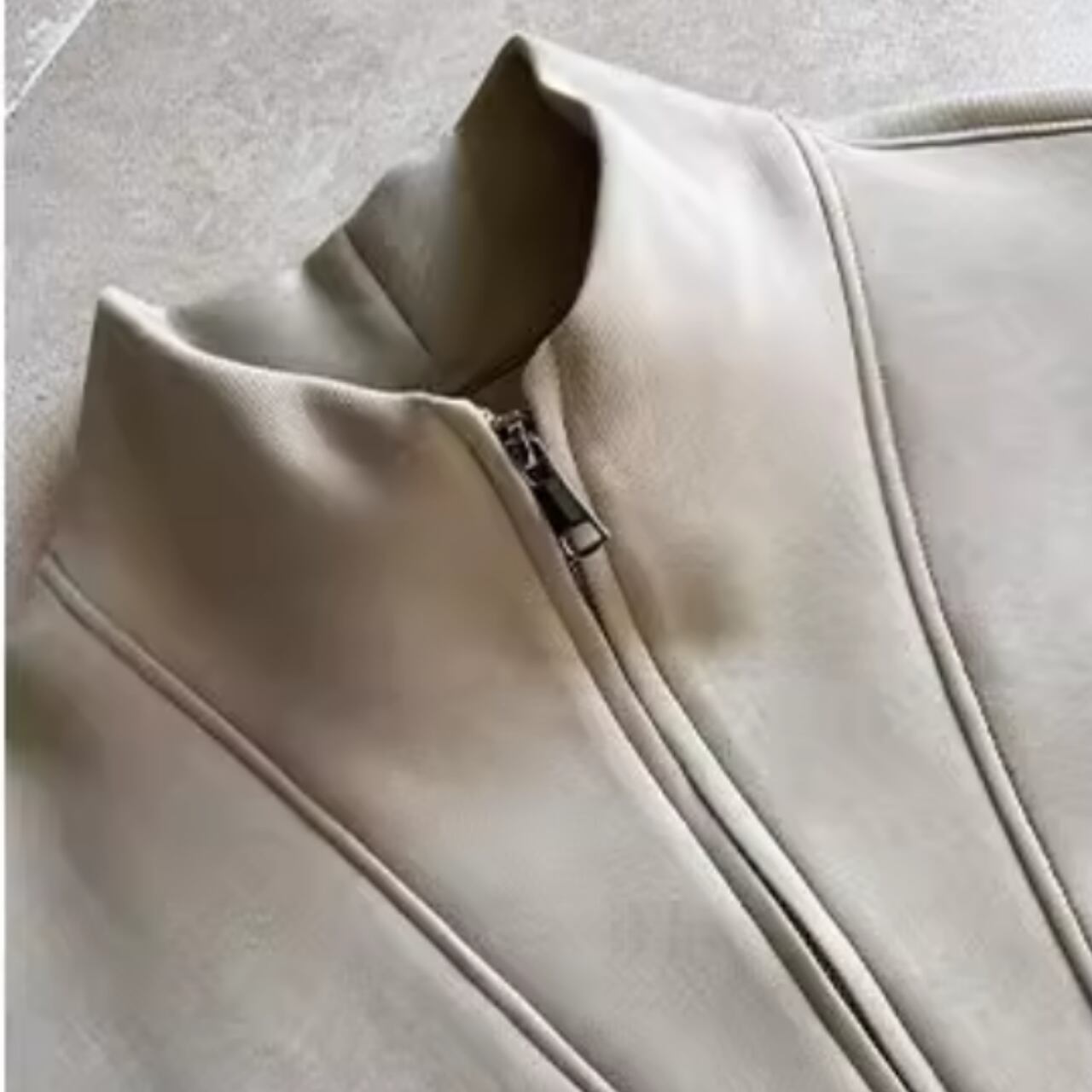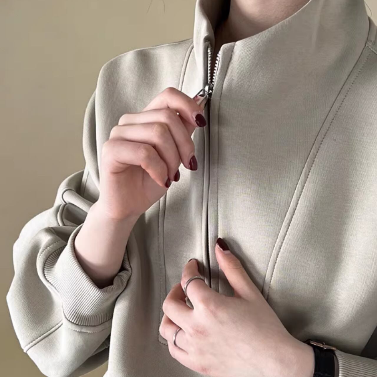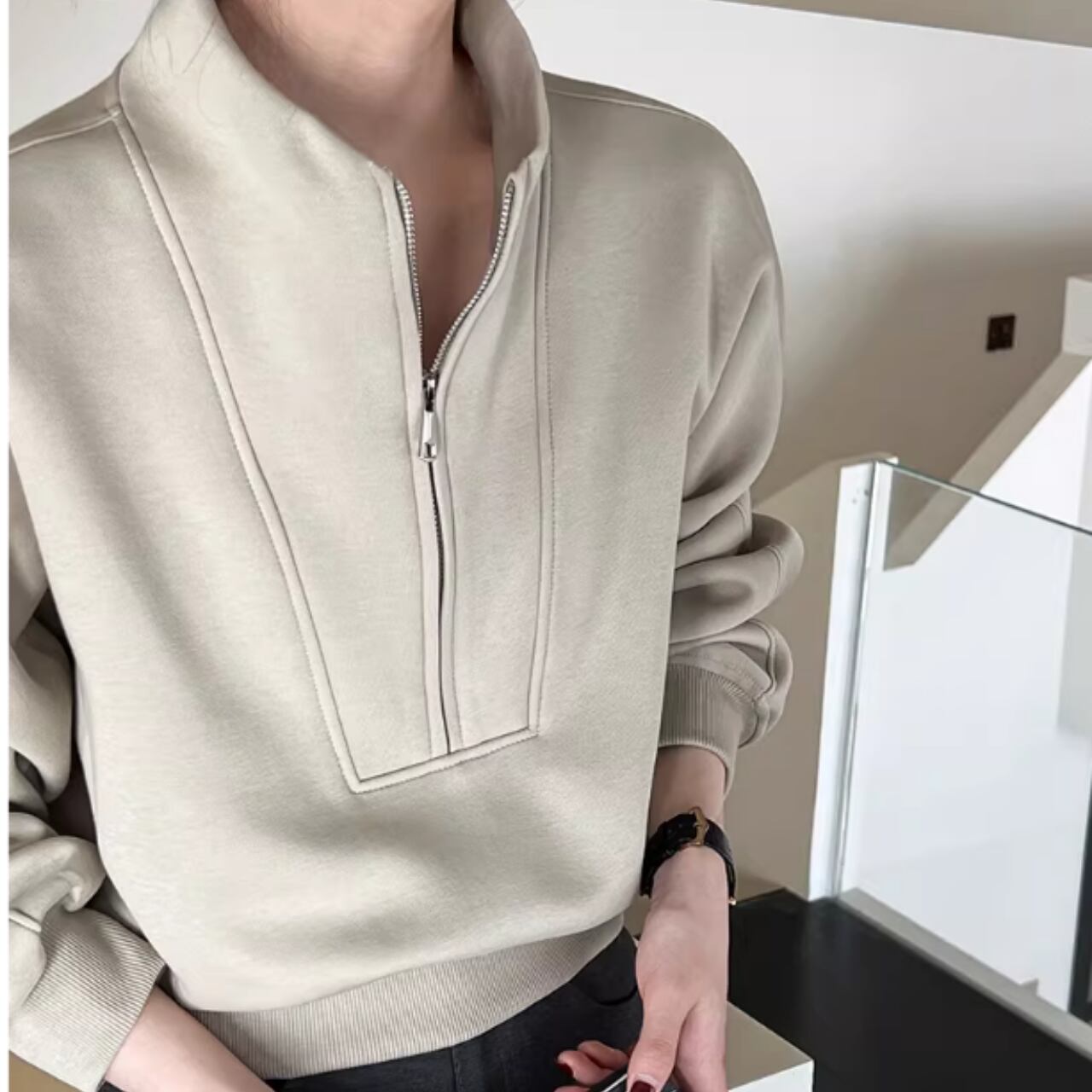 ハーフジップを開けて、インナーをチラ見せする着こなしもおすすめです。