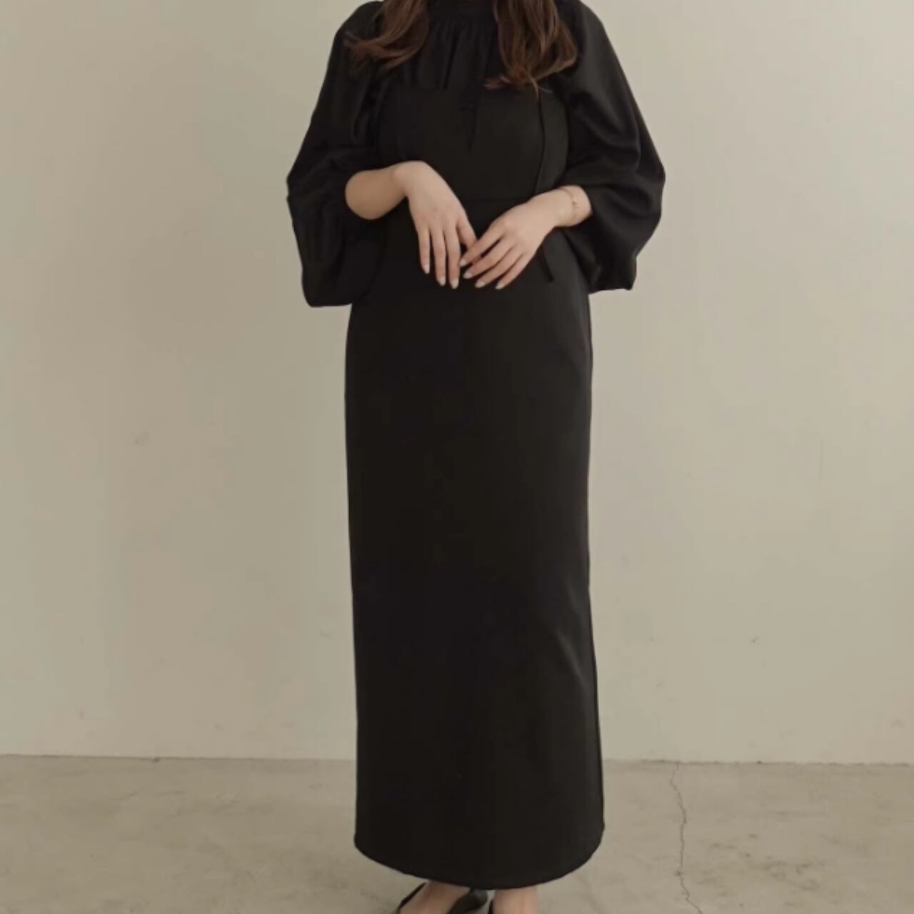 マキシ丈のデザインで、落ち着いた雰囲気を演出します。