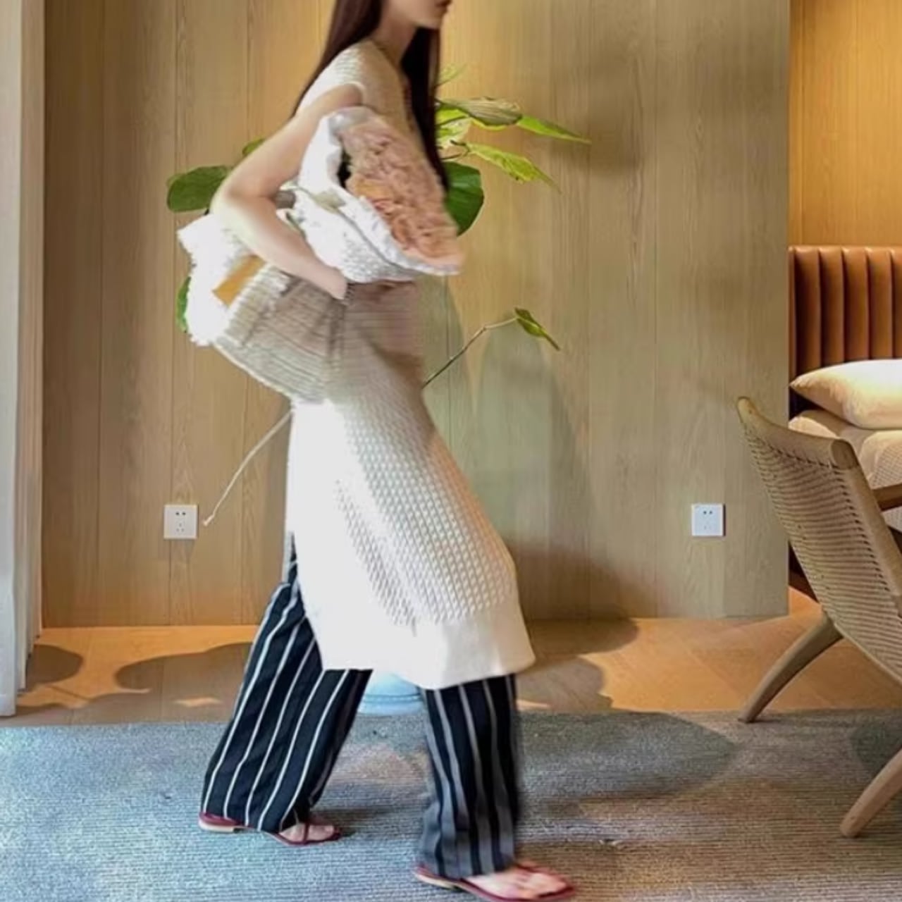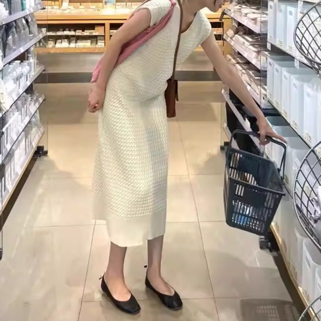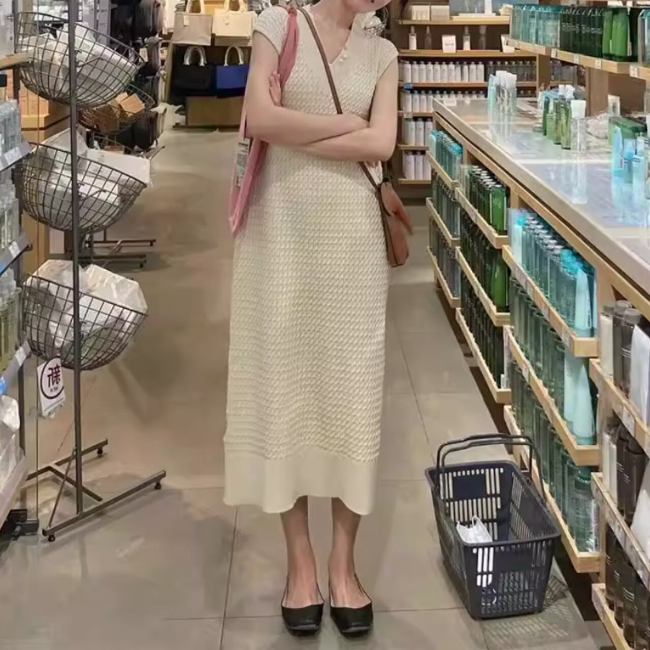 ノースリーブで涼しげな印象を与え、ミモレ丈が上品さをプラスします。
